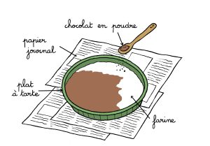 L'expérience est salissante ! Recouvre le sol de papier journal ou, mieux, va dans le jardin. Remplis un plat à tarte de farine. En agitant une petite cuillère, saupoudre une fine couche de chocolat sur toute la farine.
