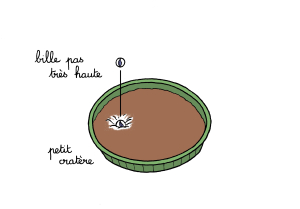 Prends deux billes. Accroupis-toi et laisse tomber une bille dans le plat. La bille creuse un trou. La farine est repoussée sur les côtés et tu vois un petit cratère blanc.