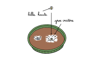 Plus une bille tombe de haut, plus elle va vite, tappe fort et agrandit son cratère. Sur la Lune aussi, il y a plein de cratères, grands, minuscules ou profonds, creusés par des cailloux tombés de l'espace. Ces cratères sont différents car les cailloux, gros ou petits, tombent à la verticale ou à l'oblique, sur des sols différents. Après la farine, essaye un autre sol lunaire : bombarde tes météorites sur du fromage blanc !
