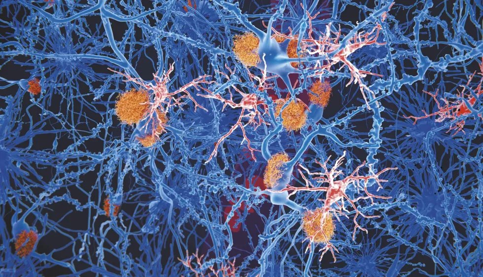 Illustration de plaques amyloïdes (en orange) sur des cellules nerveuses.